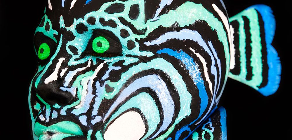 Maquillaje artístico realizado sobre el rostro de una persona. La colocación de una calva de látex nos ayuda a tapar el pelo largo de la modelo y así conseguir mejor ese efecto de pez. Los ojos están maquillados sobre sus párpados cerrados, así crea ese efecto de ojo de pez.